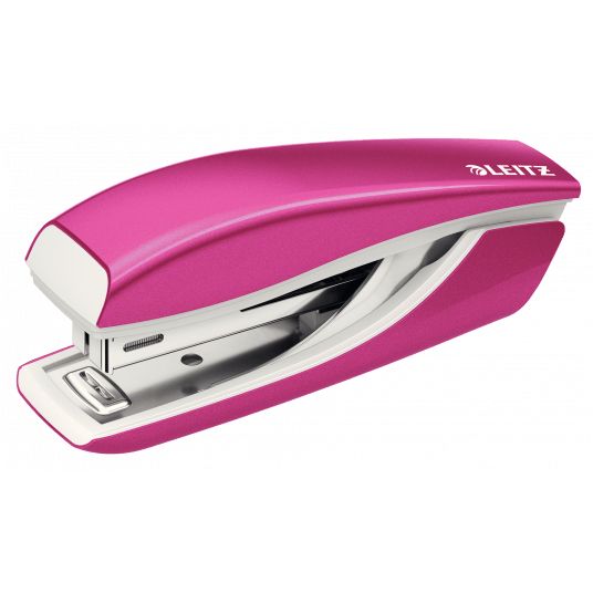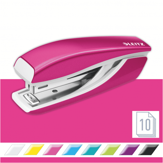 Niewielki, poręczny zszywacz w wyrazistych kolorach WOW do użytku w biurze, w domu i podczas podróży. - zszywa do 10 kartek (papier 80 gsm) - precyzyjne zszywanie dzięki technologii Direct Impact - otwarcie 180° umożliwia zszywanie tapicerskie - do zszywek Leitz Power Performance P2 No. 10, opakowanie zszywek w komplecie - poręczny zintegrowany rozszywacz - 10-letnia gwarancja przy stosowaniu zszywek Leitz oraz certyfikat bezpieczeństwa GS - kompaktowy rozmiar ułatwia używanie w czasie podróży - kolor: różowy metaliczny.