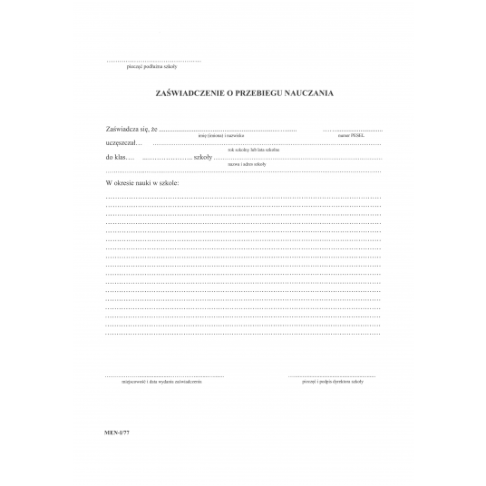 MEN-I/77 - Zaświadczenie o przebiegu nauczania Typograf A4