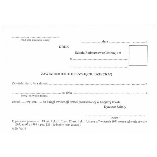 MEN-VI/19 - Zawiadomienie o przyjęciu dziecka Typograf A6