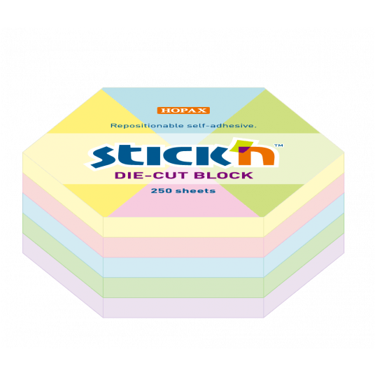- notes samoprzylepny kostka w kształcie sześciokąta o wymiarach 61 x 70 mm