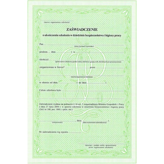 Zaświadczenie o ukończeniu szkolenia w dziedzinie BHP Typograf A4