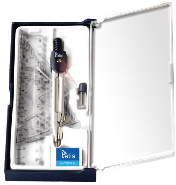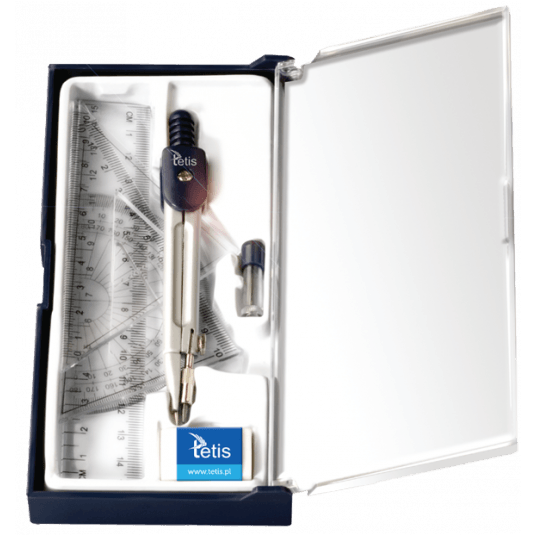 - komplet zawiera: cyrkiel, 2 ekierki 10cm/7cm, linijkę 15 cm, kątomierz 8,5 cm, gumkę ołówkową oraz zapasowe grafity (2 sztuki) - opakowanie: pudełko 6 kpl.