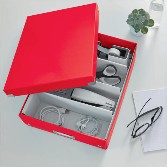 - wnętrze pudełka można podzielić na 2, 3 lub 4 części, co pomaga zapobiec plątaniu się kabli czy właściwie posegregować przedmioty, np. zdjęcia