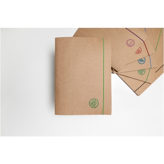 Teczka z gumką wykonana z ekologicznej jasno brązowej tektury typu Kraft podlegającej 100% recyklingowi. - dostępna w gramaturze 300g - wyposażona w gumkę w kolorze druku - posiada trzy wewnętrzne klapki zabezpieczające dokumenty przed wypadnięciem - format A4+ - okładka z motywem graficznym: ziemia