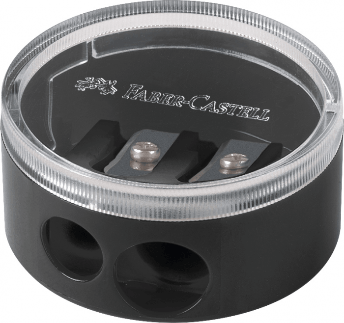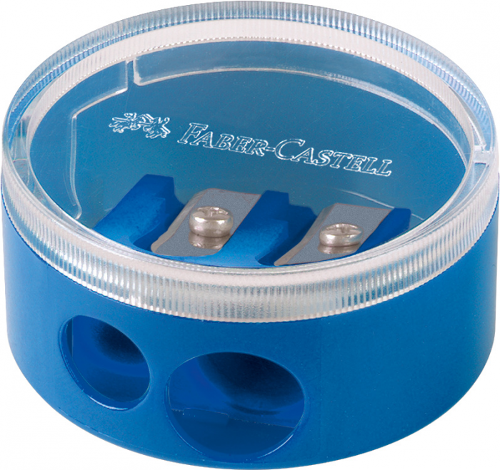 Temperówka podwójna Faber-Castell z pojemnikiem na ostrużyny. - w kolorze czarnym, czerwonym i niebieskim - idealna do szkoły i biura - przeznaczona do klasycznych i trójkątnych kredek i ołówków w standardowym rozmiarze i Jumbo - ze śrubką zabezpieczającą.