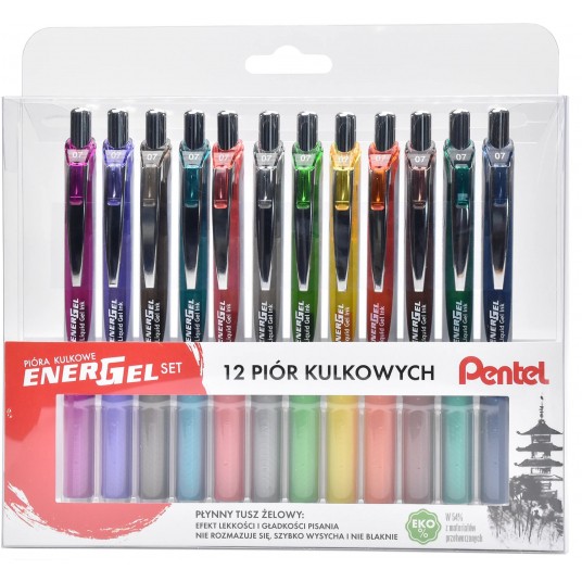 Zestaw 12 piór kulkowych do pisania i tworzenia innowacyjnych ilustracji. - EnerGel Set to kolorystyczne kompozycje z myślą o nadaniu barw Twoim notatkom - te zestawy to idealny pomysł na prezent, stworzone z myślą o osobach, które lubią mieć pod ręką intensywne kolory - wykonane w 54% z materiałów przetworzonych, na wkłady wymienne LR7 (0,7 mm)