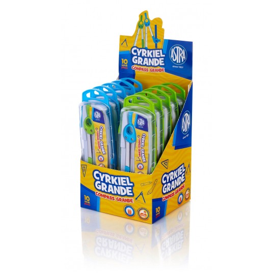 Cyrkiel Astra z metalicznymi ramionami i miejscem na wpisanie imienia. Zestaw zawiera cyrkiel, ołówek, dodatkowe rysiki oraz uchwyt na ołówek. Dodatkowo znajduje się w poręcznym i praktycznym etui.