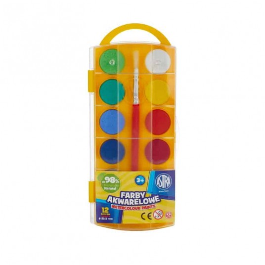 Farby akwarelowe Astra to wysokiej jakości farby wodorozcieńczalne gwarantujące żywe i intensywne kolory. Dzięki wysokiej jakości drobno roztartych pigmentów farby doskonale rozprowadzają się na papierze. Pozwalają również łączyć się z farbami temperowymi, plakatowymi i kredkami woskowymi Astra.