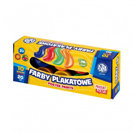 Farby plakatowe do malowania na papierze, kartonie, drewnie, nieglazurowanej ceramice i kamieniu. Wodorozcieńczalne farby kryjące są niezwykle wydajne i cechują się soczystymi i niezwykle intensywnymi barwami. Składają się w 98% z naturalnych składników i są odporne na działanie światła i ścieranie.