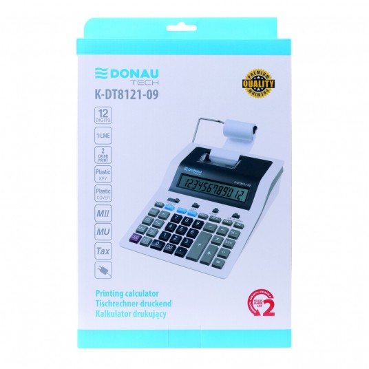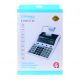 Kalkulator drukujący Kolor: Biały; Wymiary: 267mm x 202mm x 77mm; Zasilanie: Bateria; Szerokość papieru: 58mm; Drukowanie w dwóch kolorach: niebiesko–czerwonym; Posiada 12cyfrowy wyświetlacz; Wyłącza się automatycznie.