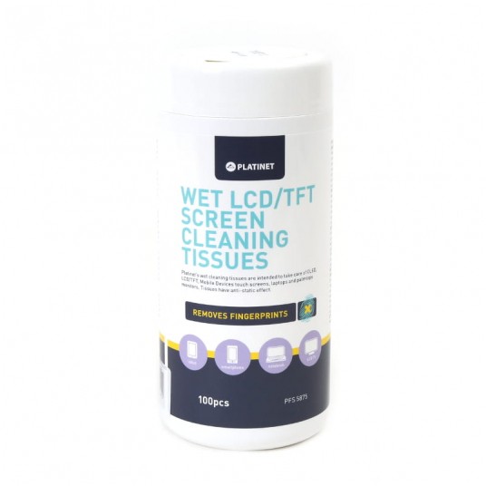 Chusteczki czyszczące do monitorów TFT/LCD. 100 nawilżanych chusteczek marki Platinet idealnie nadających się do czyszczenia monitorów i telewizorów LCD/TFT. Usuwają tłuste plamy, odciski palców i inne zanieczyszczenia, jednocześnie są bezpieczne i nie uszkadzają ekranu. Pozostawiają antystatyczną powłokę zabezpieczającą przed ponownym osadzaniem się brudu.