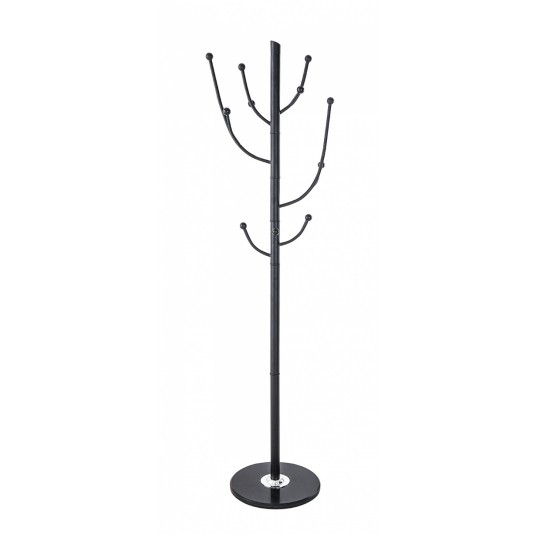 wieszak stojący na odzież wierzchnią wykonany z wytrzymałej stali malowanej proszkowo z marmurową podstawą, która zapewnia stabilność posiada 11 haczyków do odwieszania ubrań idealnie sprawdzi się w domowym wnętrzu, poczekalni czy biurze wymiary: 35x178cm kolor: czarny