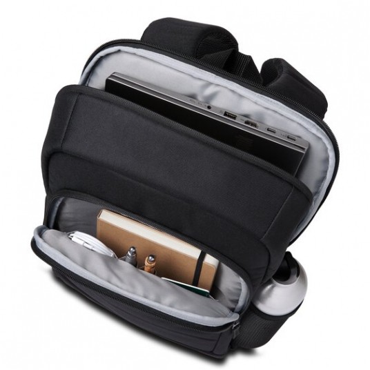 Dla osób podróżujących zawodowo, które szukają niedrogiego, wygodnego w podróży plecaka wykonanego z ekologicznych materiałów, plecaki EQ na laptopa 14” to idealne rozwiązanie. Wykorzystując 14,5 plastikowych butelek o pojemności 250 ml, każdy plecak EQ na laptopa 14" został wykonany w 42% z poliestru pochodzącego z recyklingu poużytkowego (PCR). Nowoczesny i lekki, plecak oferuje wyściełaną przegrodę na laptopa oraz zapinaną na zamek przednią kieszeń zapewniającą łatwy dostęp do urządzeń peryferyjnych. Podwójne kieszenie boczne oferują miejsce na butelki z wodą lub parasol. Wyściełane paski na ramiona zapewniają wygodne wsparcie dla szyi i ramion, a wyściełana oddychająca tkanina siatkowa zapewnia większy komfort dla pleców.