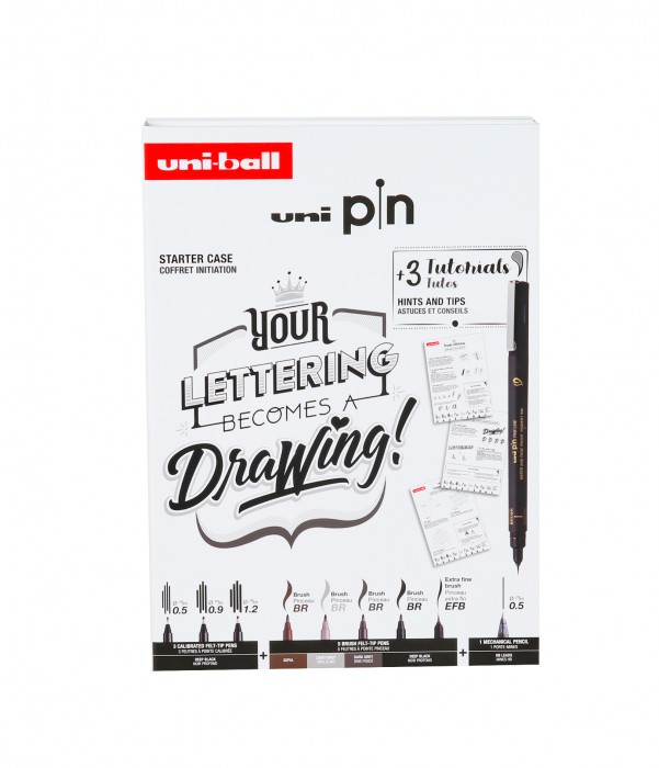 - zestaw z różnymi grubościami i rodzajami końcówek: Starter Case Lettering: 0,5 mm, 0,9 mm, 1,2 mm + 5 końcówek pędzelkowych (kolory sepia, jasnoszary, szary i czarny oraz cienki pędzelek w kolorze czarnym) + 1 ołówek mechaniczny Shalaku S