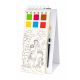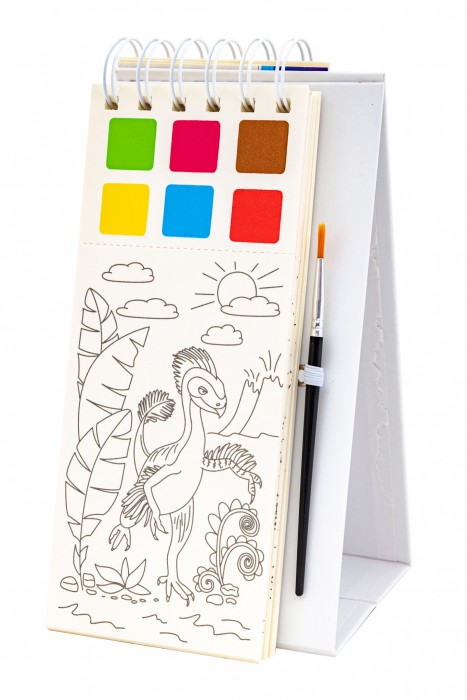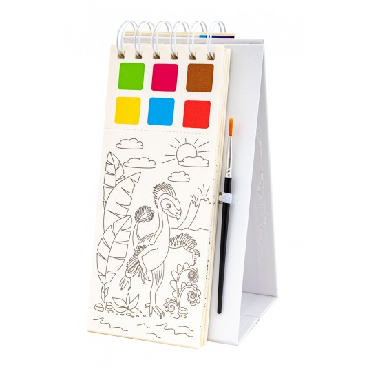 - w skład zestawu wchodzi: tekturowa rozkładana sztaluga, która zapewnia stabilne podparcie podczas malowania, 20 graficznych szablonów z różnorodnymi wzorami, na których znajduje się paleta 6 kolorów farb akwarelowych na każdej stronie, pędzelek