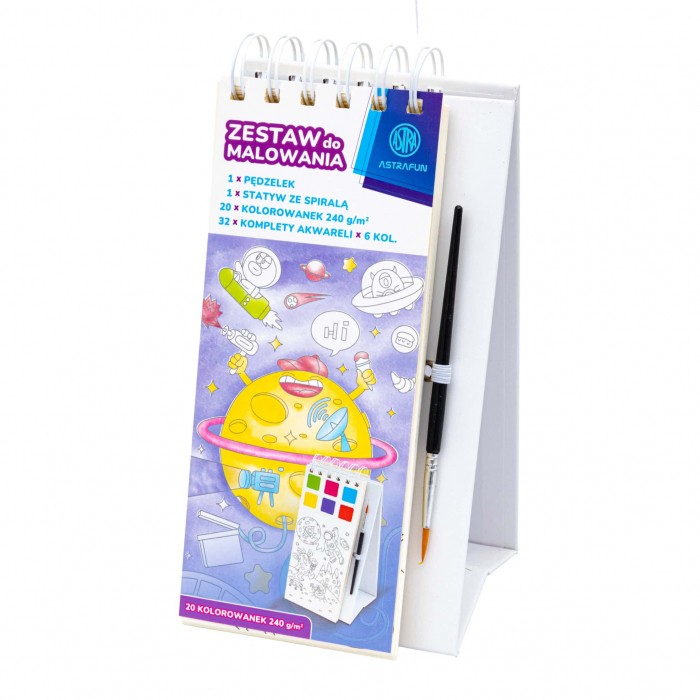- w skład zestawu wchodzi: tekturowa rozkładana sztaluga, która zapewnia stabilne podparcie podczas malowania, 20 graficznych szablonów z różnorodnymi wzorami, na których znajduje się paleta 6 kolorów farb akwarelowych na każdej stronie, pędzelek