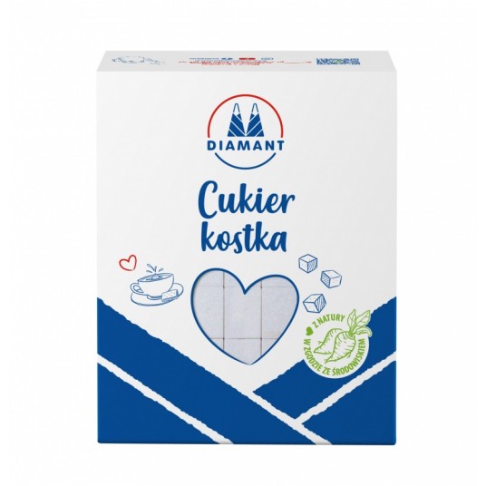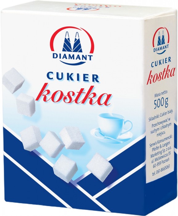 cukier kostka DIAMANT to rafinowany i skrystalizowany cukier biały, który następnie jest zwilżany i prasowany w kostki wielkość kostki odpowiada standardowej łyżeczce sypkiego cukru cukier w kostkach stosowany jest do słodzenia gorących napojów waga netto: 0,5 kg