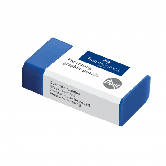 Gumka do wymazywania Dust Free Faber-Castell w ochronnym opakowaniu. Zrównoważone połączenie tworzyw sztucznych powoduje, że wymazywanie nie zostawia smug. Minimalna ilość ścinków, które łatwo się zwijają, co ułatwia czyszczenie. Odpowiednia do grafitowych ołówków i kredek. Czarny kolor nie pozostawia zabrudzeń. Przetestowana i zatwierdzona dermatologicznie.