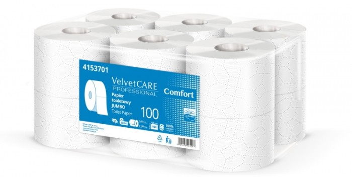 papier toaletowy "JUMBO" 100% celuloza papier 2 warstwowy wysokość rolki: 92 mm średnica rolki: 180 mm długość rolki: 100 mb pasujący podajnik VLP-5600025 ilość listków na rolce: 800 opakowanie: 12 rolek kolor: biały