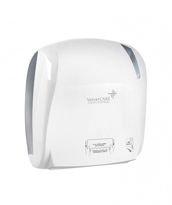 podajnik do ręczników Velvet 150m każde pociągniecie ręcznika dozuje 27cm. przy 150m rolce jest to 555 „listków” wymiary produktu (wys/gł/szer): 371x221x330 mm waga: 2,7 kg materiał ABS (osłona), MABS (spód i okno) kolor: biały zasilanie mechaniczne