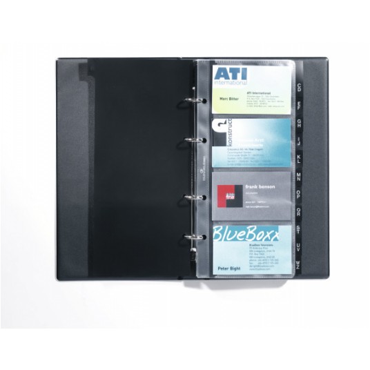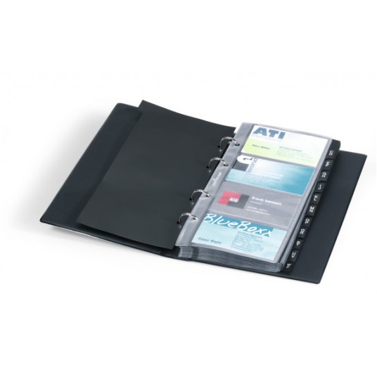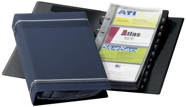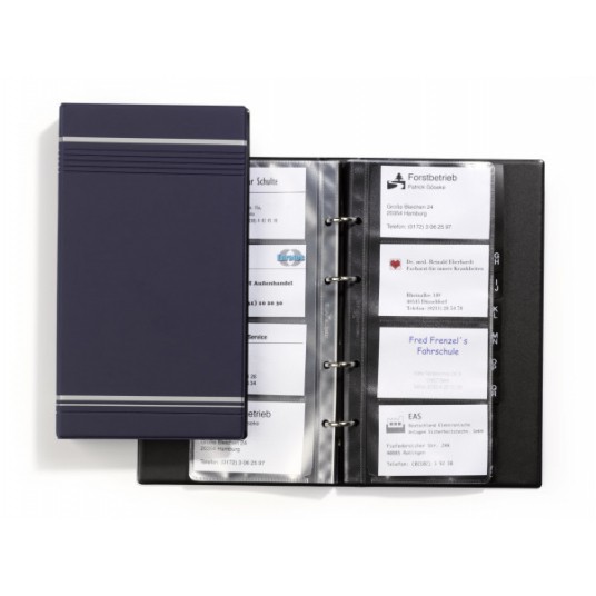 - album na 200 wizytówek - okładka matowa w kolorze granatowym lub grafitowym - mechanizm ringowy - przekładki: A - Z - możliwość umieszczenia dodatkowych wkładów (maksymalnie do 280 wizytówek) - dodatkowe wkłady do albumu na wizytówki (N1371) koloru transparentnego - opakowanie zawiera 10 koszulek