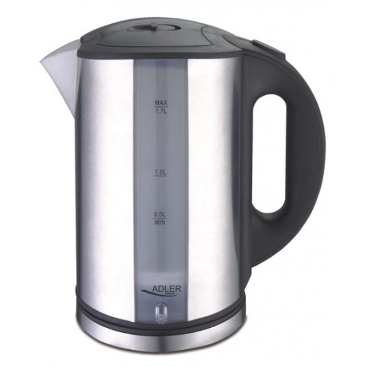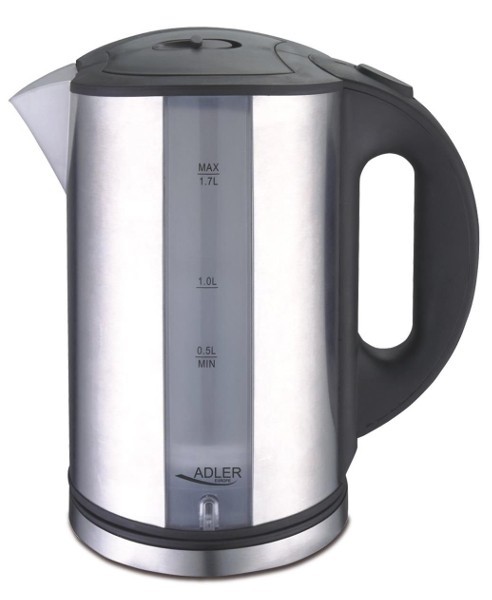 Czajnik elektryczny o ergonomicznym kształcie, pojemność min. 0,5 l, obrotowa podstawa i płaskie dno, wskaźnik poziomu wody z podziałką, filtr zatrzymujący osady wapnia, grzałka ze stali szlachetnej, obudowa INOX, wnętrze plastikowe, podświetlany wskaźnik poziomu wody, lampka kontrolna, automatyczne wyłączanie po zagotowaniu wody, rok gwarancji