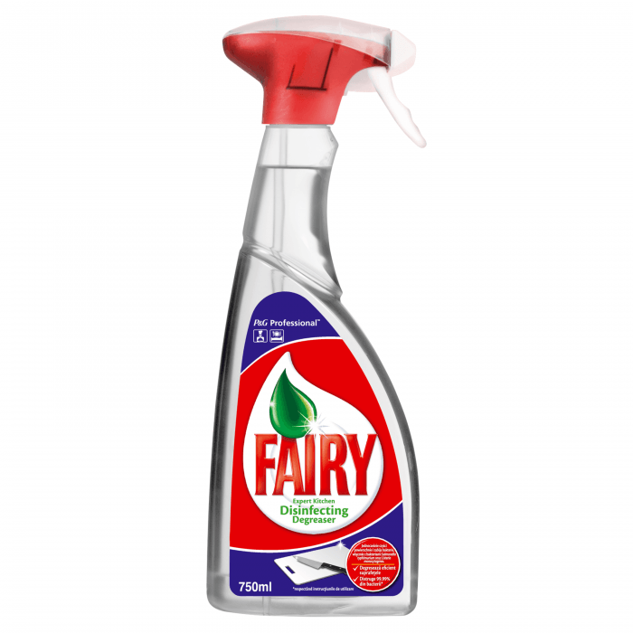 Kuchenny środek dezynfekujący I odtłuszczający Fairy Professional to gotowy do użycia przeciwbakteryjny spray umożliwiający łatwe czyszczenie powierzchni oraz urządzeń w profesjonalnych kuchniach. Dezynfekuje zgodnie z wytycznymi UE: EN1276 i EN13697. Może być bezpiecznie stosowany na większości powierzchni nadających się do mycia, takich jak powierzchnie ze stali nierdzewnej, emaliowane czy ceramiczne.