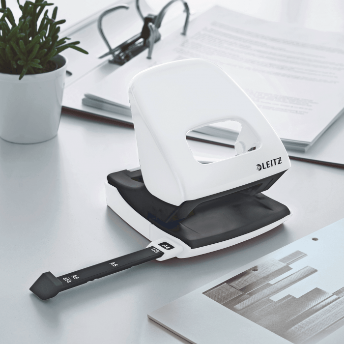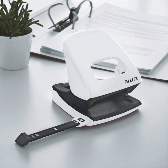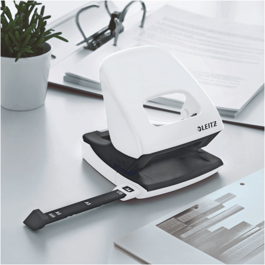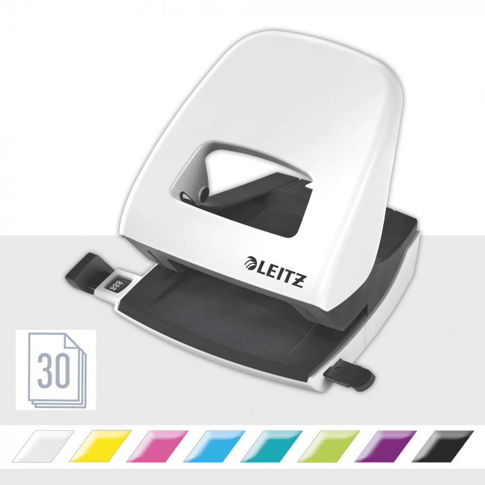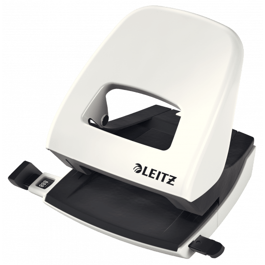 Dziurkacz Leitz WOW to mocny metalowy dziurkacz do codziennego użytku. - dziurkuje do 30 kartek (papier 80 gsm) - łatwo dopasowujący się wygodny uchwyt i wytrzymałe ostrza zmniejszają wysiłek podczas dziurkowania - wyraźne oznaczenia formatu i wytrzymała prowadnica zapewniają doskonałe wyrównanie papieru - łatwy do opróżniania pojemnik na ścinki zamontowany na zawiasach - 10-letnia gwarancja i certyfikat bezpieczeństwa GS - kolor: biały metaliczny.
