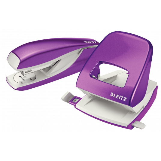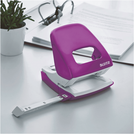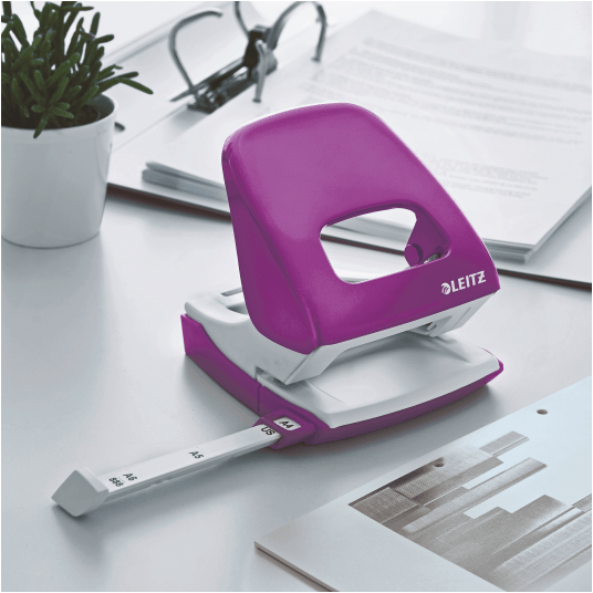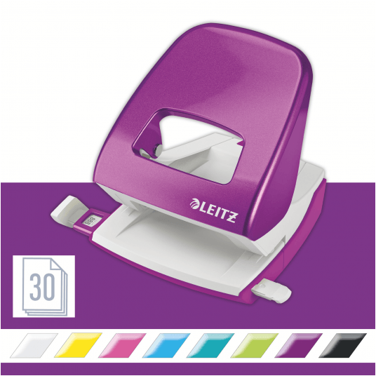 Dziurkacz Leitz WOW to mocny metalowy dziurkacz do codziennego użytku. - dziurkuje do 30 kartek (papier 80 gsm) - łatwo dopasowujący się wygodny uchwyt i wytrzymałe ostrza zmniejszają wysiłek podczas dziurkowania - wyraźne oznaczenia formatu i wytrzymała prowadnica zapewniają doskonałe wyrównanie papieru - łatwy do opróżniania pojemnik na ścinki zamontowany na zawiasach - 10-letnia gwarancja i certyfikat bezpieczeństwa GS - kolor: fioletowy metaliczny.