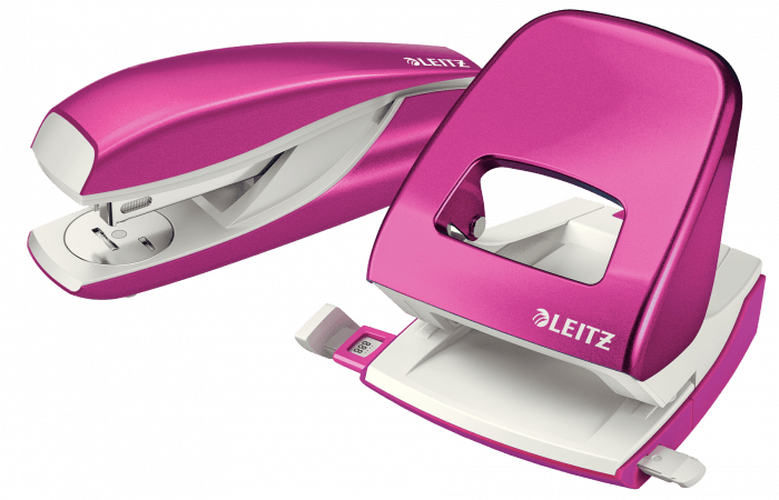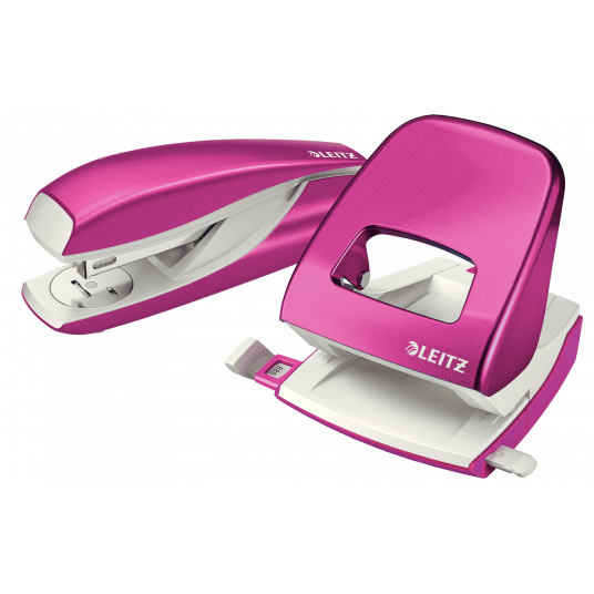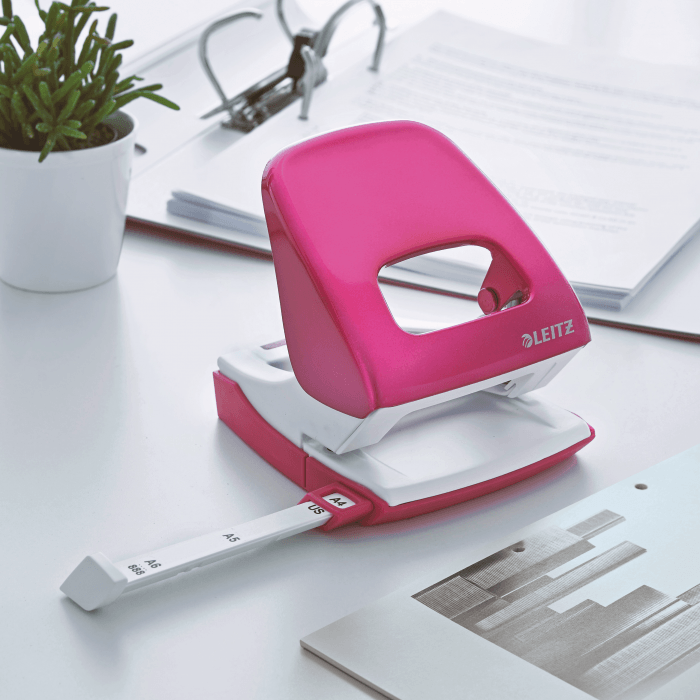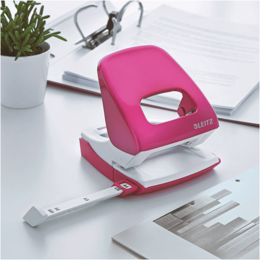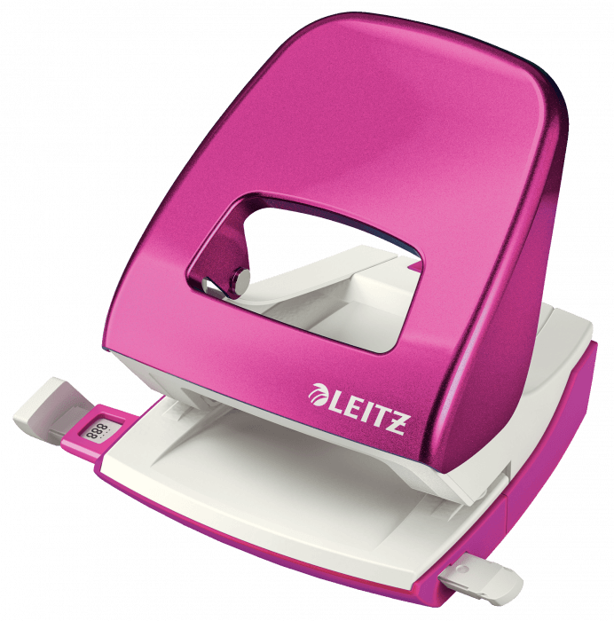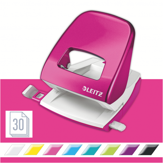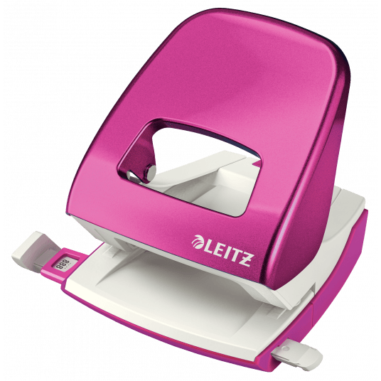 Dziurkacz Leitz WOW to mocny metalowy dziurkacz do codziennego użytku. - dziurkuje do 30 kartek (papier 80 gsm) - łatwo dopasowujący się wygodny uchwyt i wytrzymałe ostrza zmniejszają wysiłek podczas dziurkowania - wyraźne oznaczenia formatu i wytrzymała prowadnica zapewniają doskonałe wyrównanie papieru - łatwy do opróżniania pojemnik na ścinki zamontowany na zawiasach - 10-letnia gwarancja i certyfikat bezpieczeństwa GS - kolor: różowy metaliczny.