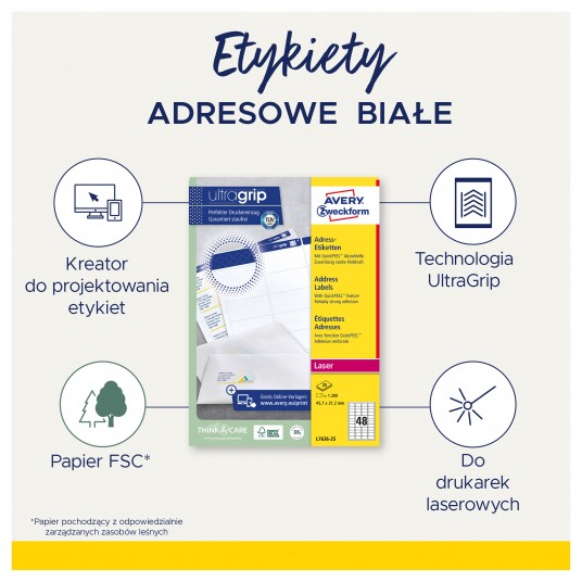 • Etykiety samoprzylepne z certyfikatem FSC są przyjazne dla środowiska i nie zawierają chloru. Papier pochodzi z odpowiedzialnie zarządzanych zasobów leśnych, a etykiety podlegają pełnej utylizacji jako odpad papierowy.