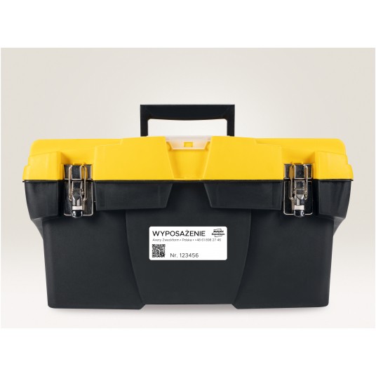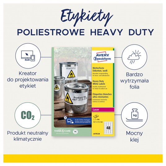 • Niezwykle wytrzymałe etykiety samoprzylepne wykonane z białego poliestru. • Wyjątkowo odporne na działanie niekorzystnych warunków otoczenia - idealne do użytku zewnętrznego. • Doskonałe do oznaczania produktów, inwentaryzacji środków trwałych, czy umieszczania informacji i komunikatów w trudnych warunkach, np.na produkcji lub budowie. • Etykiety woodoodporne, odporne na działanie smarów, brudu i temperaturę od -20°C do +80°C. • Produkcja etykiet Avery Zweckform jest neutralna pod względem emisji CO2 (certyfikat Focus Future) i zgodna ze standardem ISO14001, który pomaga zminimalizować negatywne czynniki oddziałujące na środowisko naturalne. • Przeznaczone do zadruku w drukarkach laserowych. • Darmowe i łatwe w użyciu szablony oraz oprogramowanie dostępne na www.avery-zweckform.pl