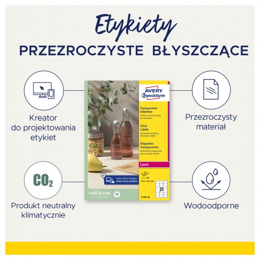 Etykiety przezroczyste Crystal Clear • Błyszczące etykiety wykonane z przezroczystego poliestru, zapewnią stylowy wygląd produktom.