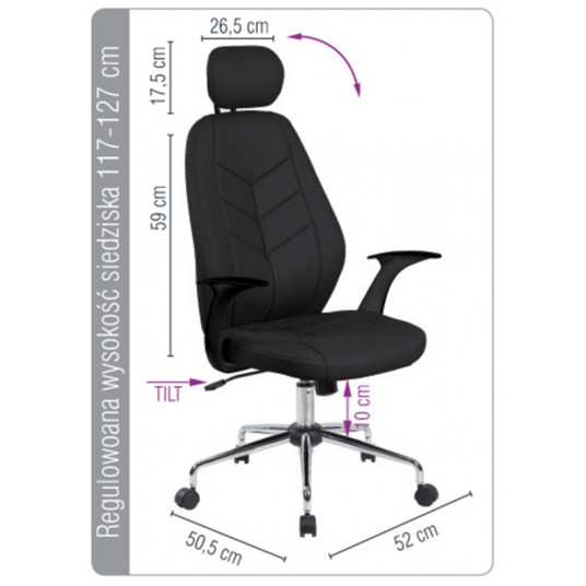 - fotel biurowy z funkcją regulacji wysokości oraz kołyski - wykonany z ekoskóry - wymiary siedziska: 52 x 50,5 cm - wymiary oparcia: 52 x 59 cm - wymiary zagłówka: 26,5 x 17,5 cm