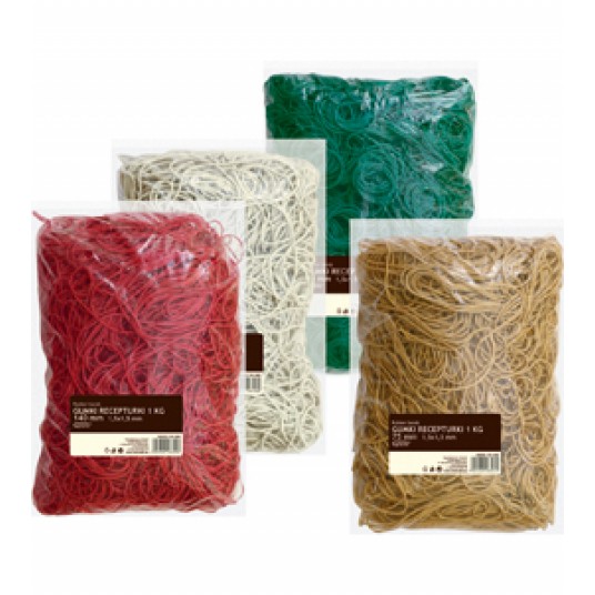 – elastyczne gumki – dostępne w 4 kolorach: naturalnym, czerwonym, zielonym oraz białym – pakowane w woreczki – rozmiar: 1,5 x 1,5 mm – średnica: 30 mm – długość po złożeniu: 5 cm – opakowanie zawiera 1 kg