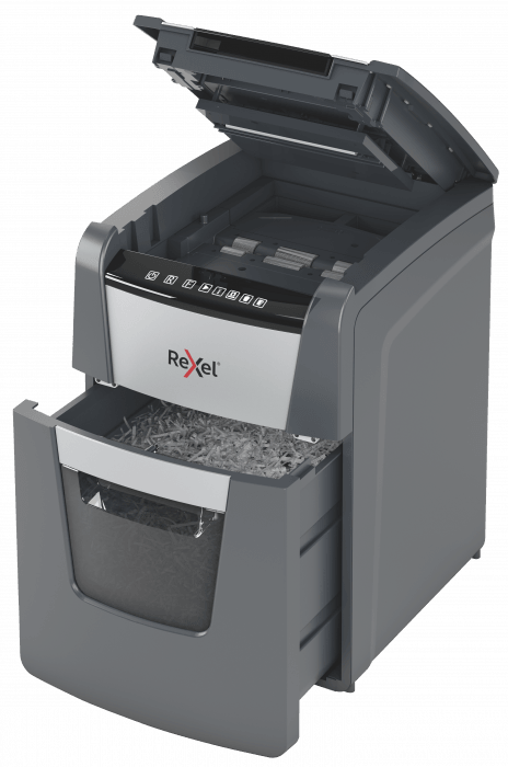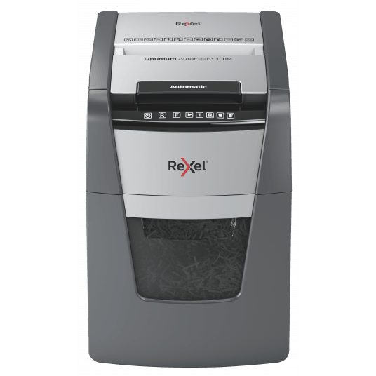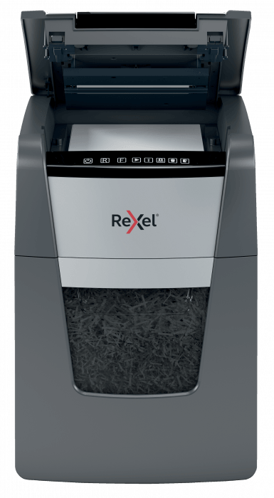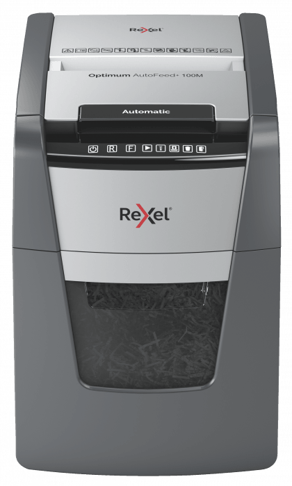 - jednorazowo niszczy automatycznie do 100 kartek A4 (80 gsm), tnąc arkusze na mikrościnki (o wymiarach 2 x 15 mm), co zapewnia poziom bezpieczeństwa P-5
