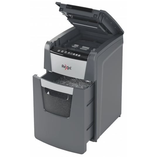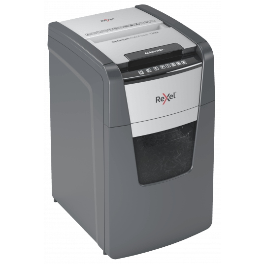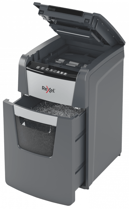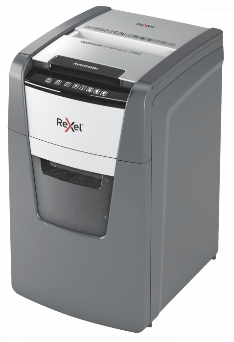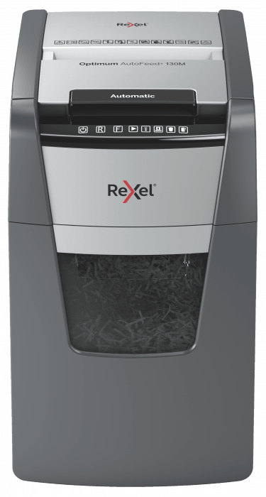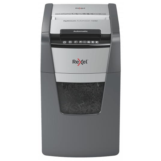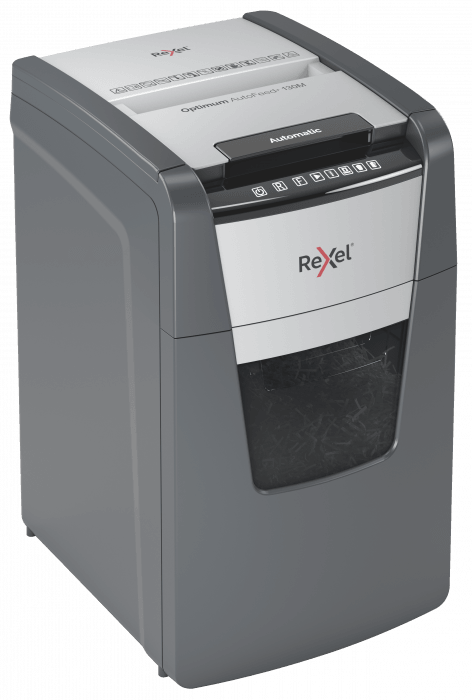 - jednorazowo niszczy automatycznie do 130 kartek A4 (80 gsm), tnąc arkusze na mikrościnki (o wymiarach 2 x 15 mm), co zapewnia poziom bezpieczeństwa P-5