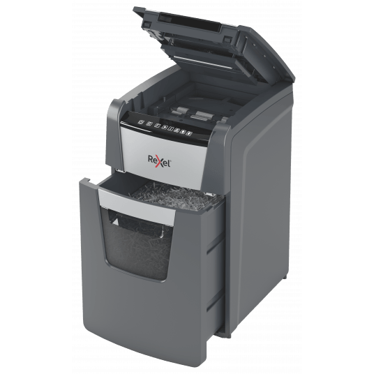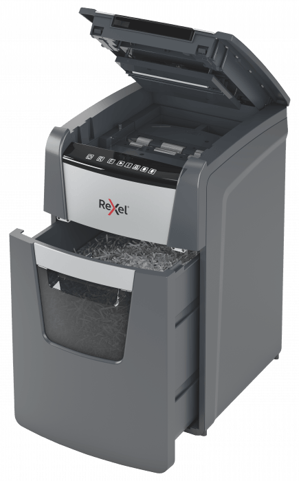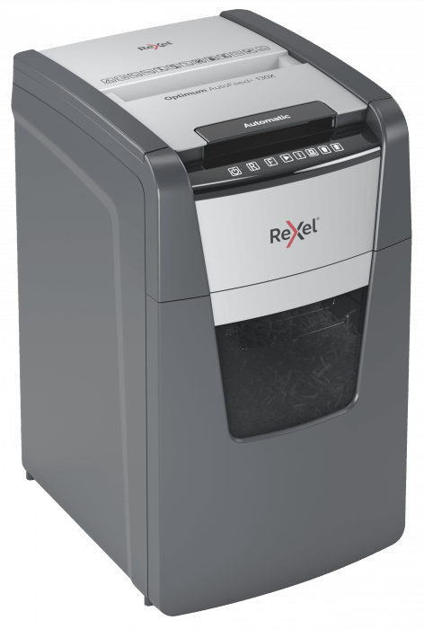 - jednorazowo niszczy automatycznie do 130 kartek A4 (80 gsm), tnąc arkusze na konfetti (o wymiarach 4 x 28 mm), co zapewnia poziom bezpieczeństwa P-4