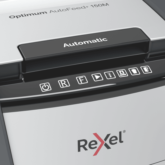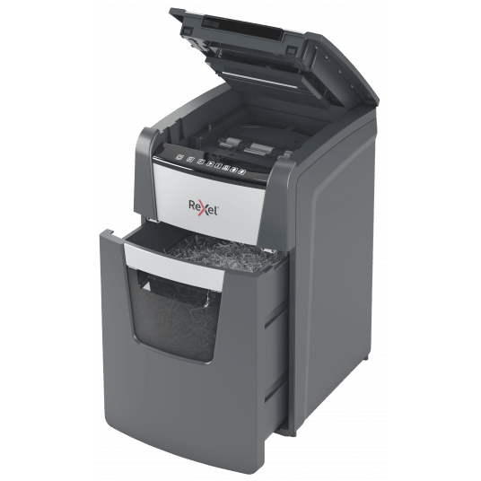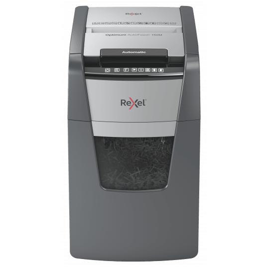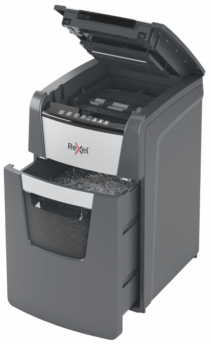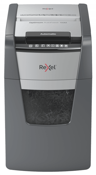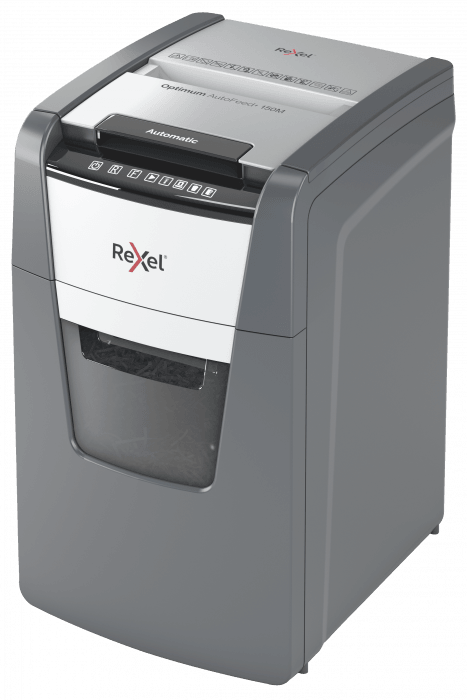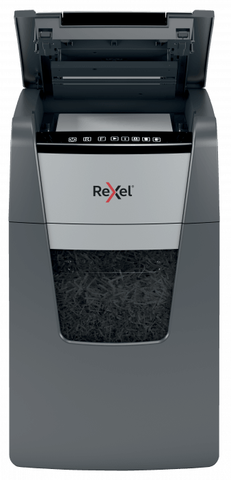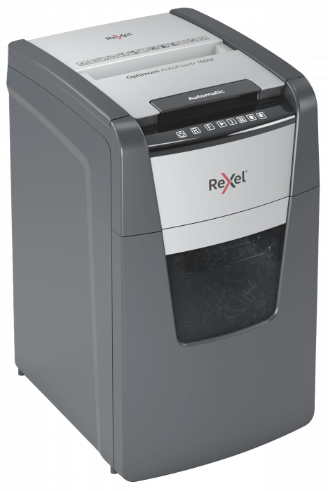 - jednorazowo niszczy automatycznie do 150 kartek A4 (80 gsm), tnąc arkusze na mikrościnki (o wymiarach 2 x 15 mm), co zapewnia poziom bezpieczeństwa P-5