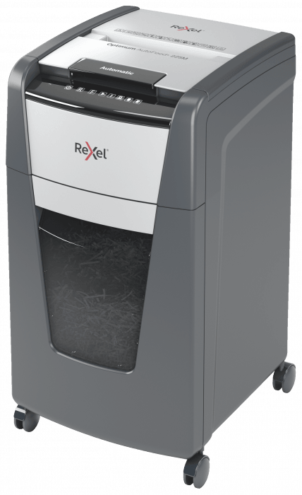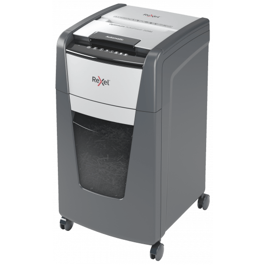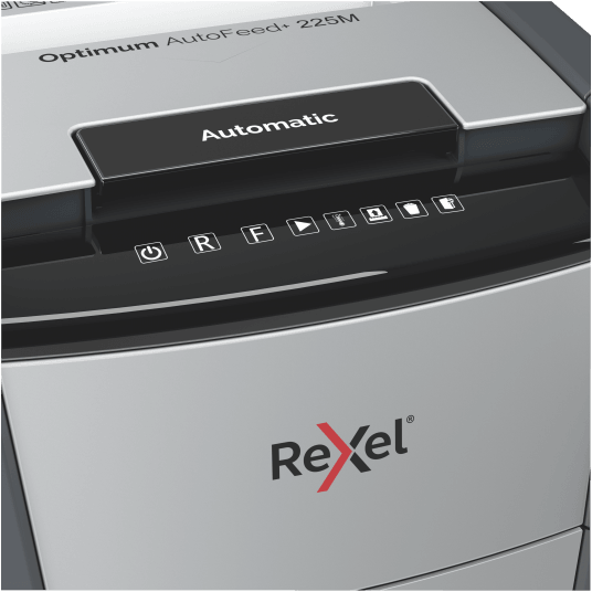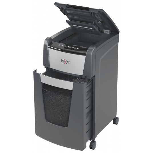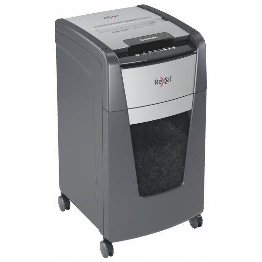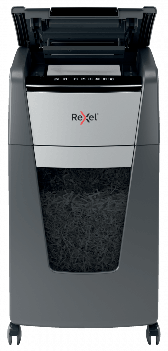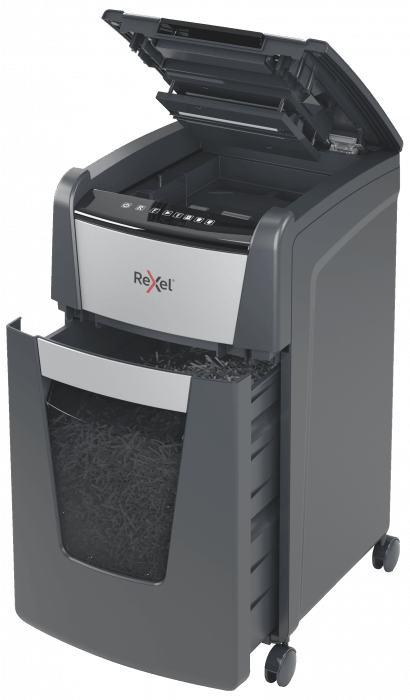 - jednorazowo niszczy automatycznie do 225 kartek A4 (80 gsm), tnąc arkusze na mikrościnki (o wymiarach 2 x 15 mm), co zapewnia poziom bezpieczeństwa P-5