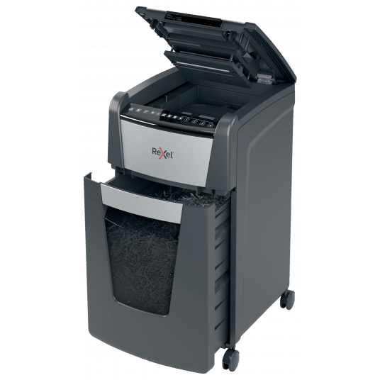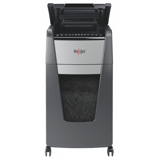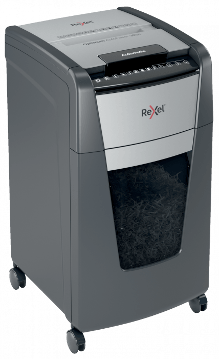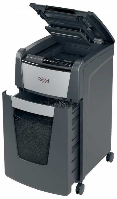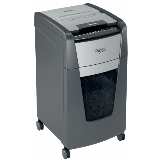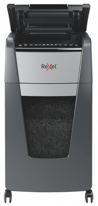 - jednorazowo niszczy automatycznie do 300 kartek A4 (80 gsm), tnąc arkusze na konfetti (o wymiarach 4 x 26 mm), co zapewnia poziom bezpieczeństwa P-4