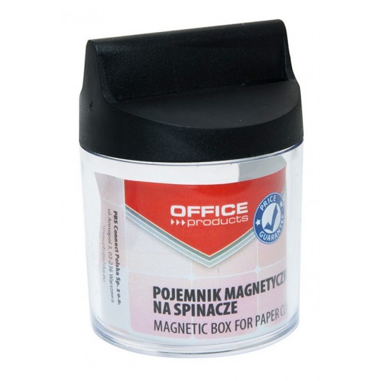 - wykonany z przezroczystego tworzywa sztucznego okrągły pojemnik z magnetycznym czarnym wieczkiem - przeznaczony do przechowywania spinaczy biurowych o różnych rozmiarach - etykieta produktowa włożona do środka produktu (bez klejenia) z nazwą marki, kodem produktu i kodem ean - indywidualnie foliowany - pojemnik wykonany z tworzywa sztucznego (polistyrenu) - kolor: transparentny