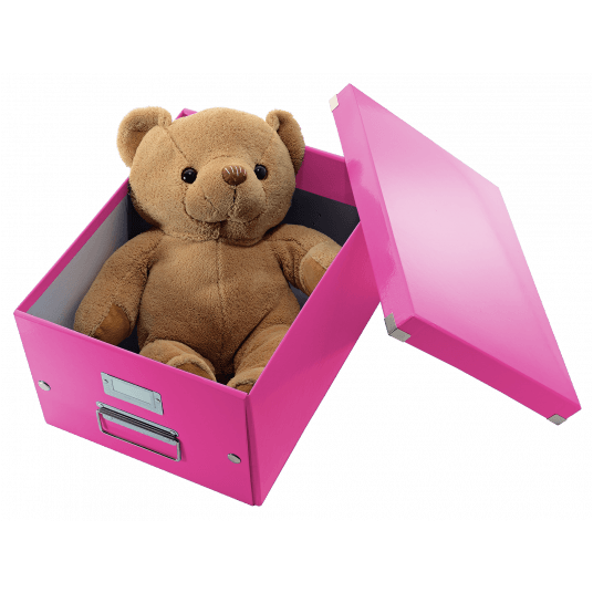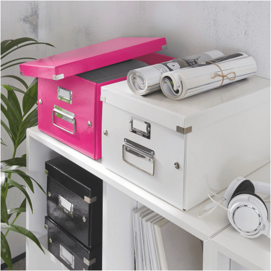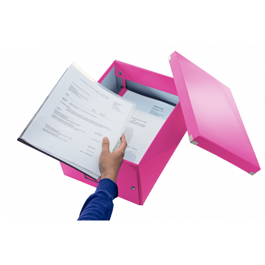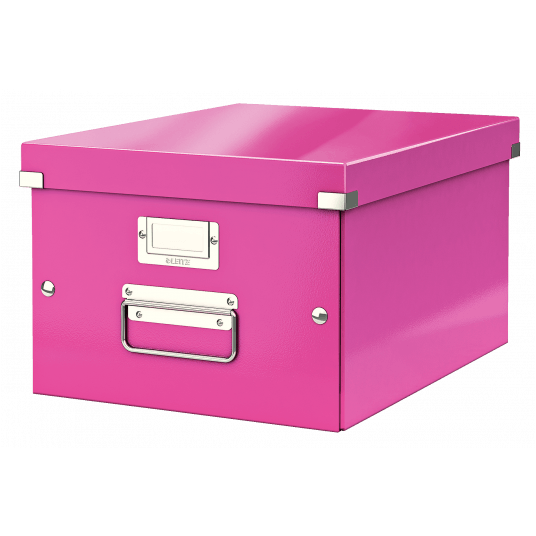 Średniej wielkości uniwersalne pudełko do przechowywania lub przenoszenia przedmiotów w formatach do A4. - szybkie i łatwe składanie/rozkładanie dzięki konstrukcji spinanej na napy (umożliwia redukcję powierzchni potrzebnej do przechowywania, kiedy pudełko nie jest używane) - laminowana powierzchnia gwarantuje wspaniały wygląd, dłuższą żywotność produktu oraz łatwość usuwania zabrudzeń - możliwość łatwego opisu zawartości dzięki wysokiej jakości metalowym ramkom na etykiety i białym etykietom - wytrzymałe metalowe uchwyty do wygodnego przenoszenia pudła - wykonane z wysokiej jakości wytrzymałego kartonu - opatentowana konstrukcja zapewnia dodatkową ochronę przed przypadkowym otwarciem pudełka z cięższą zawartością - wymiary: 281 x 200 x 370 mm - kolor: różowy metaliczny.