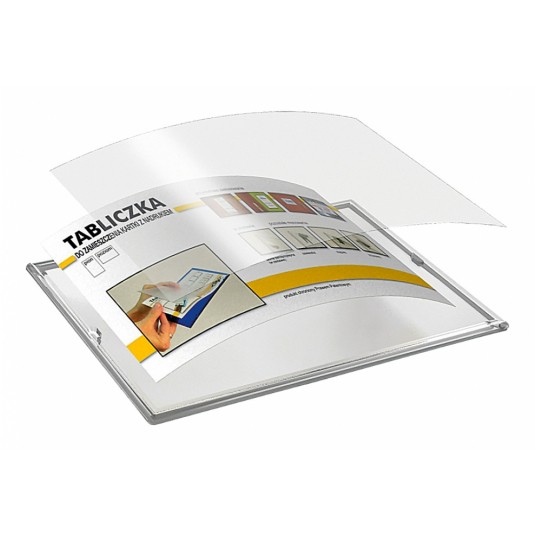 Tabliczka samoprzylepna wykonana z wysokoprzezroczystego tworzywa. - łatwy montaż i wymiana kartki - posiada w komplecie taśmę samoprzylepną - możliwość zamówienia dodatkowych mocowań: magnesu, zawieszki lub przyssawki - wymiar 150x230 mm