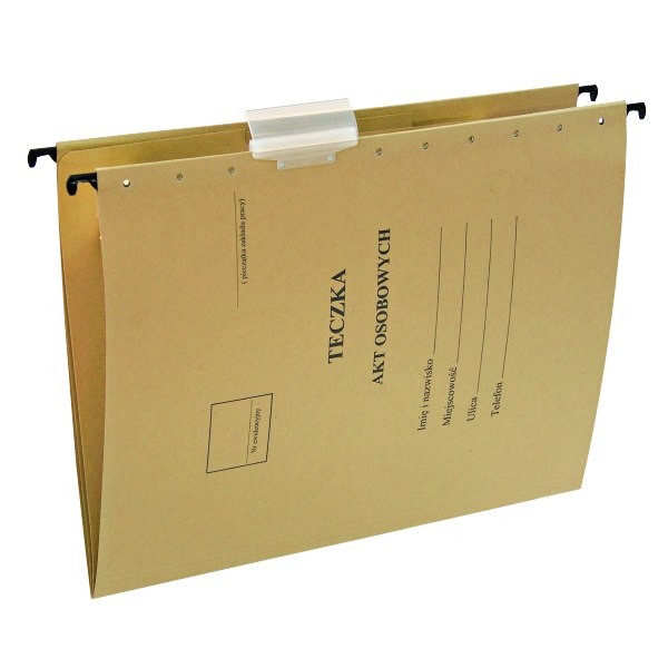 - siarczanowa - wykonana z mocnego kartonu 230 g/m2 - przeznaczona do przechowywania akt osobowych - wewnątrz 3 przegródki do zachowania standardowego podziału dokumentów z przebiegu kariery pracownika: przyjęcie do pracy, rozwój, zakończenie pracy - w każdej przegródce mechanizm skoroszytowy umożliwiający wpięcie dokumentów (luźnych kartek lub dokumentów w koszulkach) - w komplecie identyfikatory i etykiety do opisu zawartości każdej teczki - format: A4